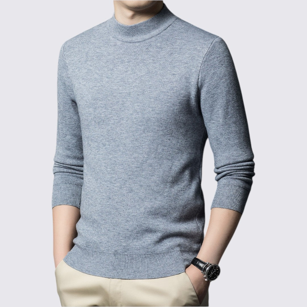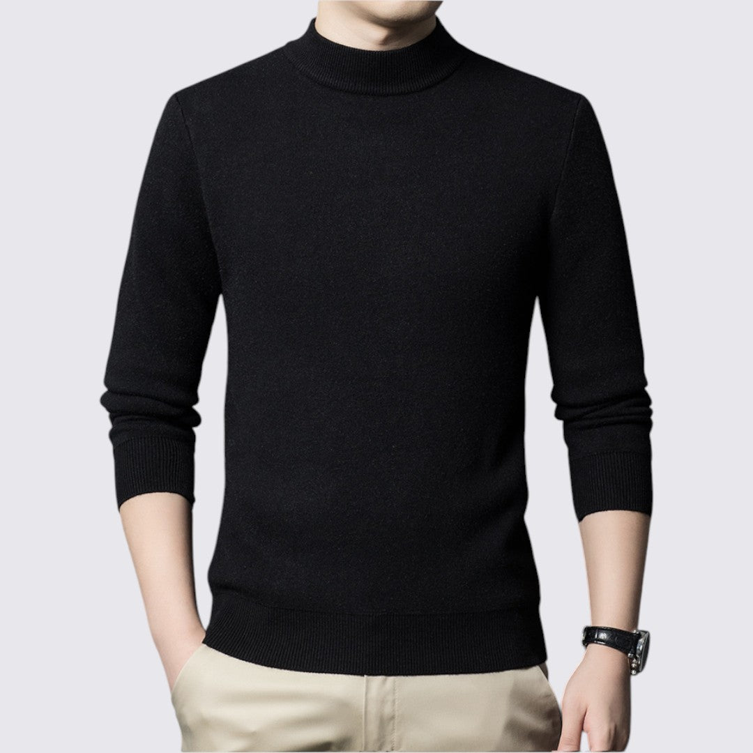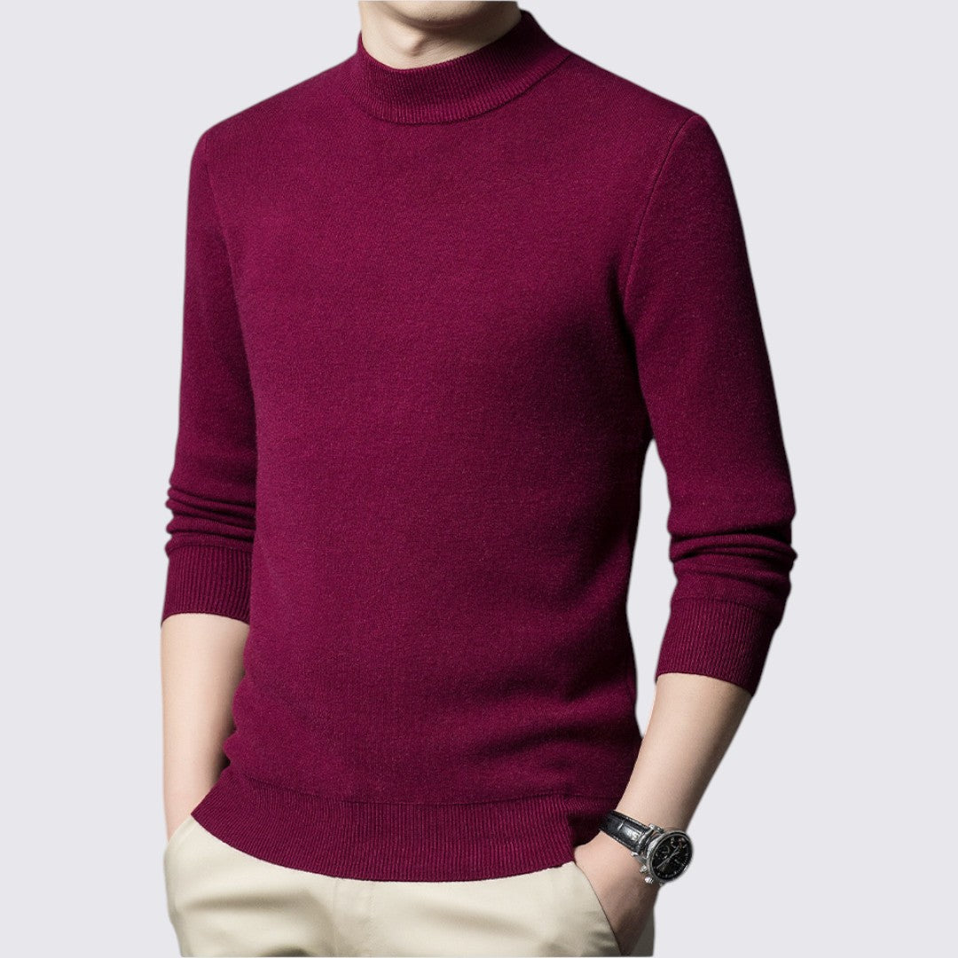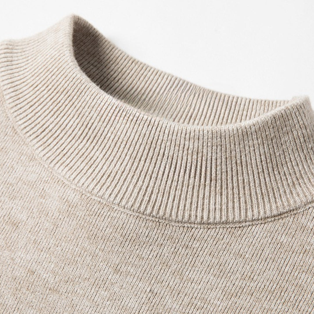 A sweater for Men. The neckline sits high in a mock-neck shape. The knit surface shows an even, regular structure. Long sleeves finish with rib cuffs at openings. The hem is ribbed with a straight line. The silhouette appears regular through the body. Intended for everyday layering in transitional weather.
