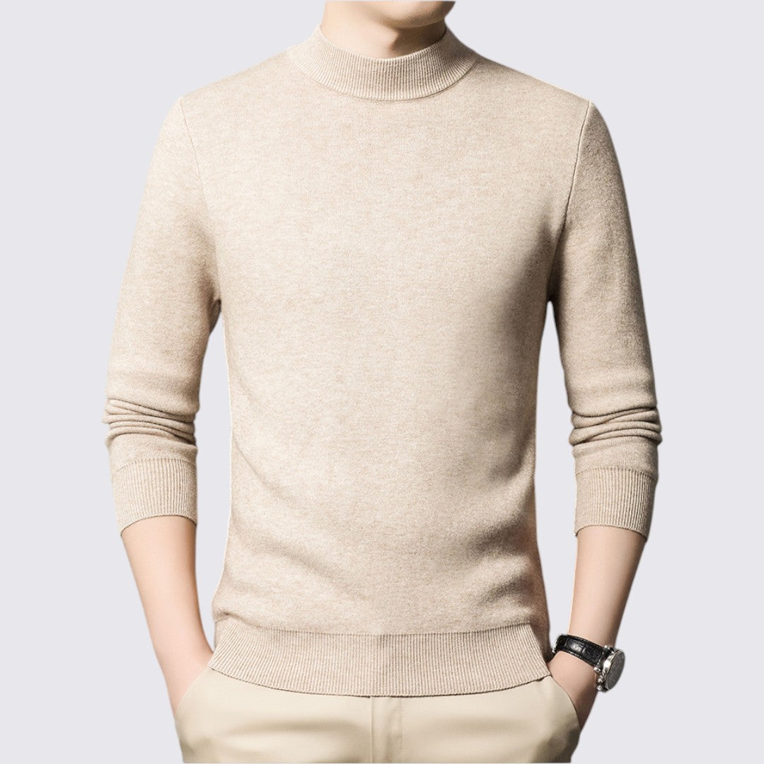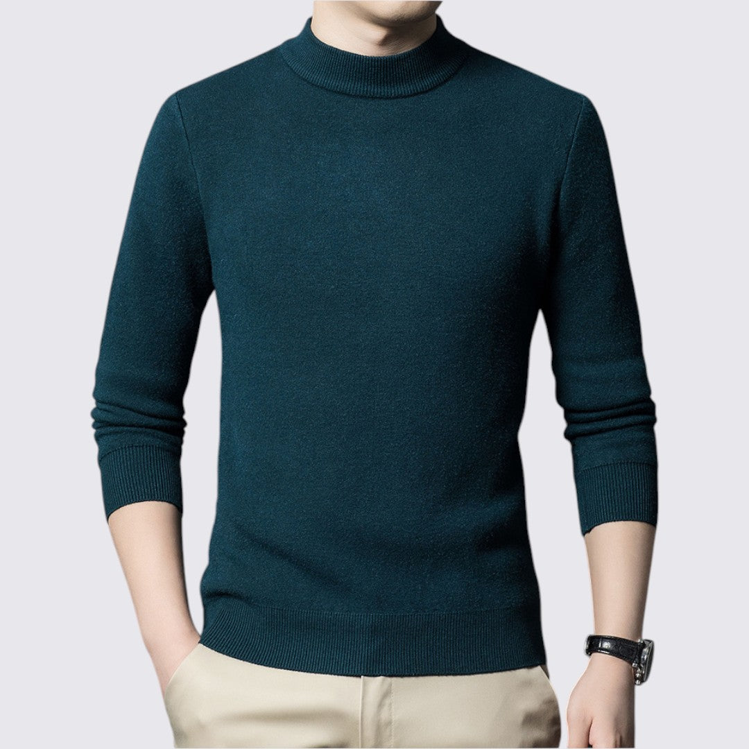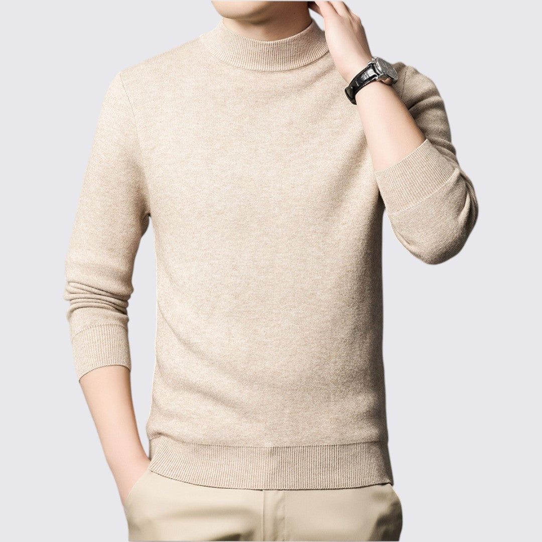 A sweater for Men. The neckline sits high in a mock-neck shape. The knit surface shows an even, regular structure. Long sleeves finish with rib cuffs at openings. The hem is ribbed with a straight line. The silhouette appears regular through the body. Intended for everyday layering in transitional weather.