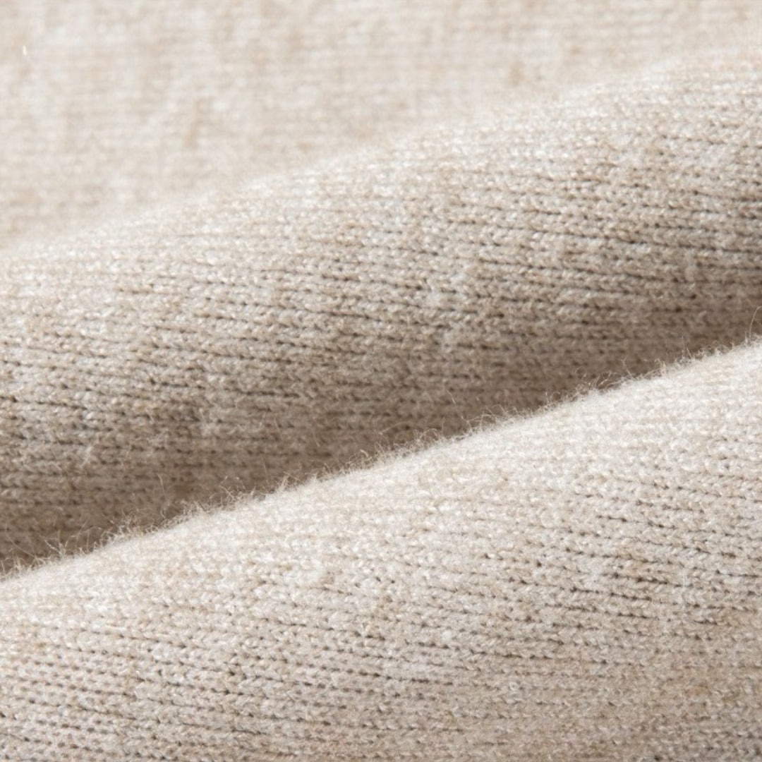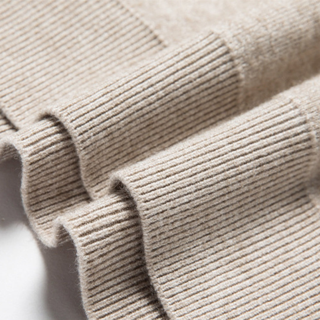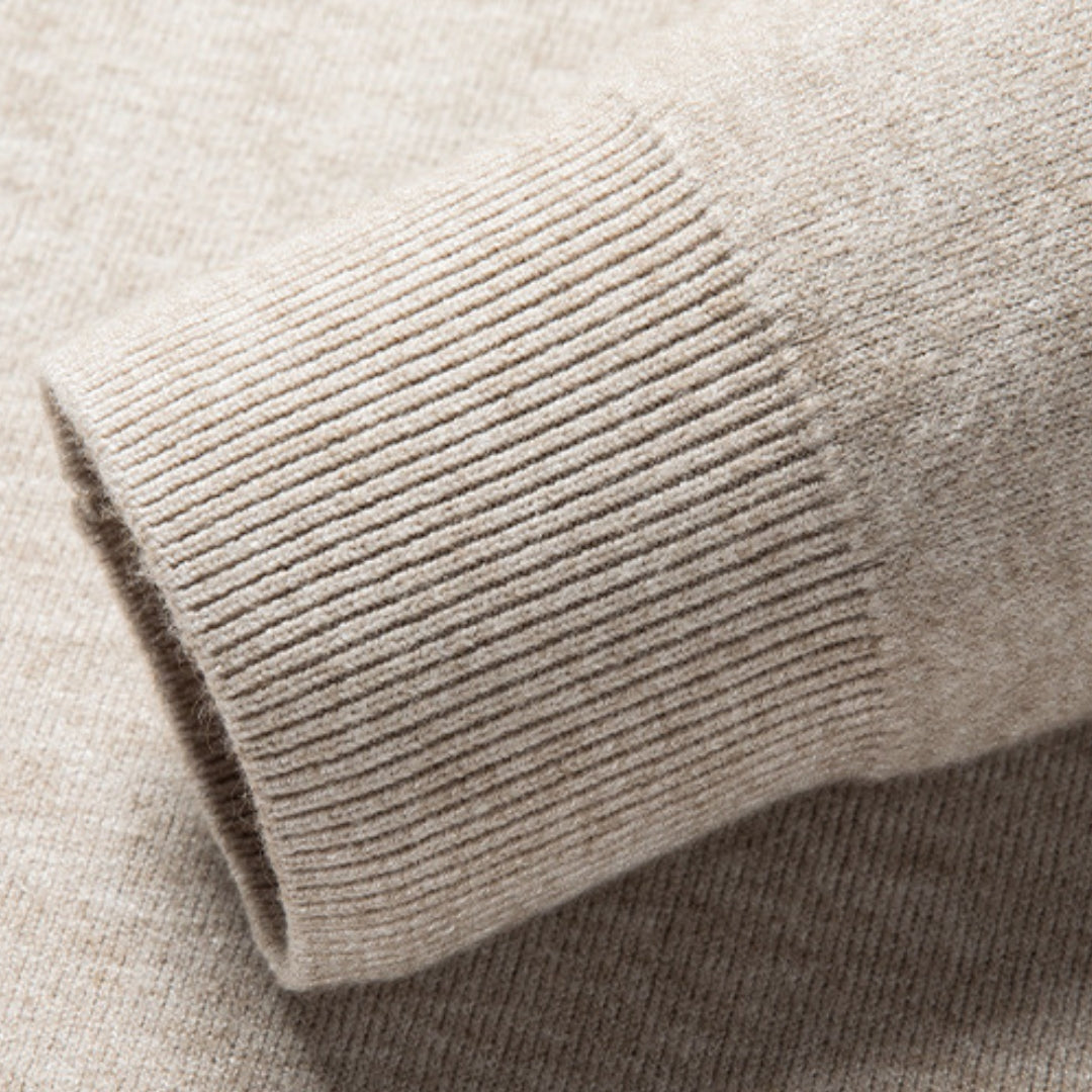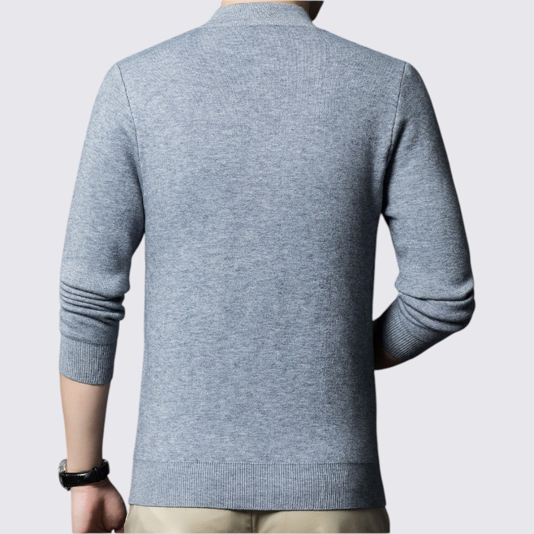 A sweater for Men. The neckline sits high in a mock-neck shape. The knit surface shows an even, regular structure. Long sleeves finish with rib cuffs at openings. The hem is ribbed with a straight line. The silhouette appears regular through the body. Intended for everyday layering in transitional weather.