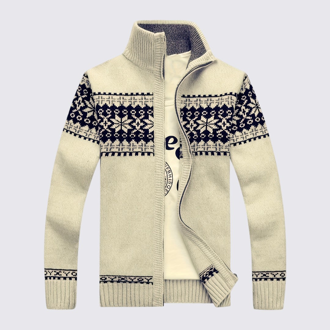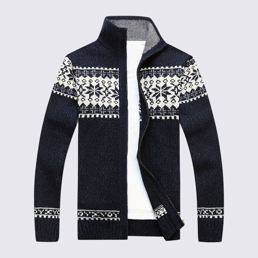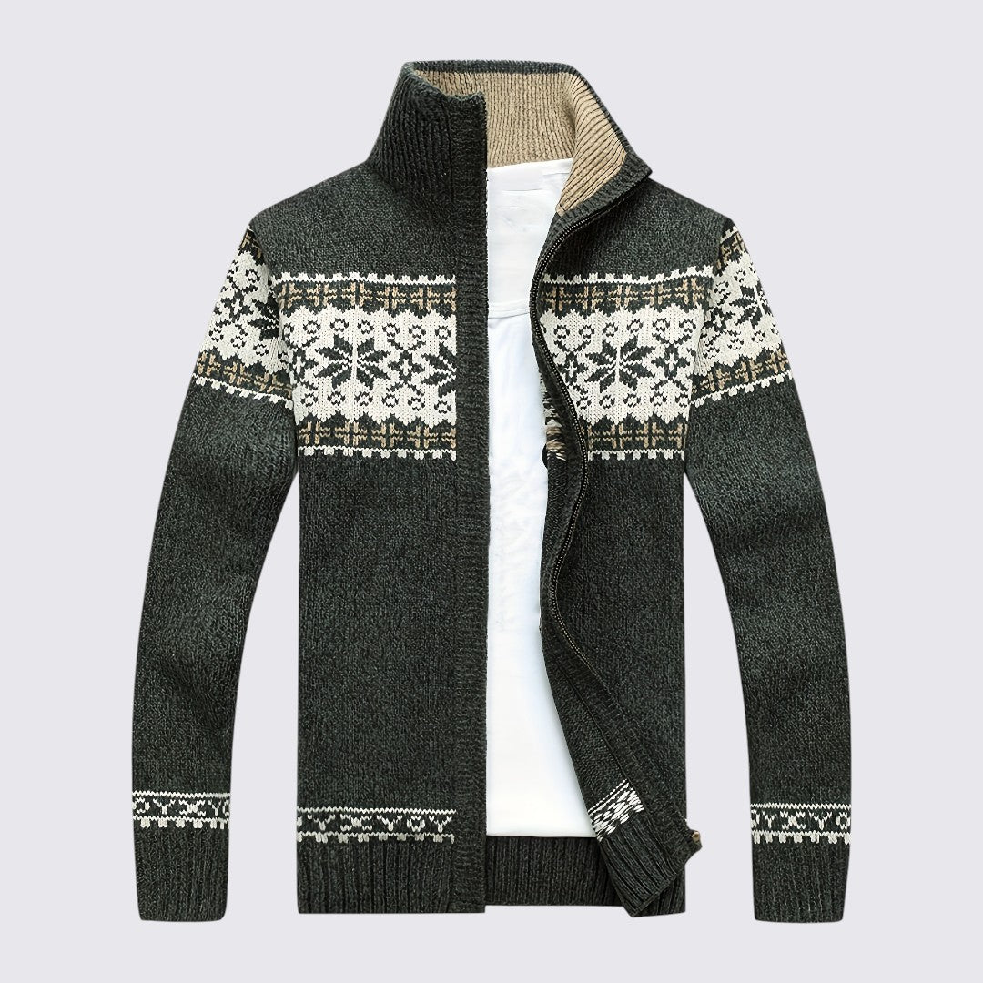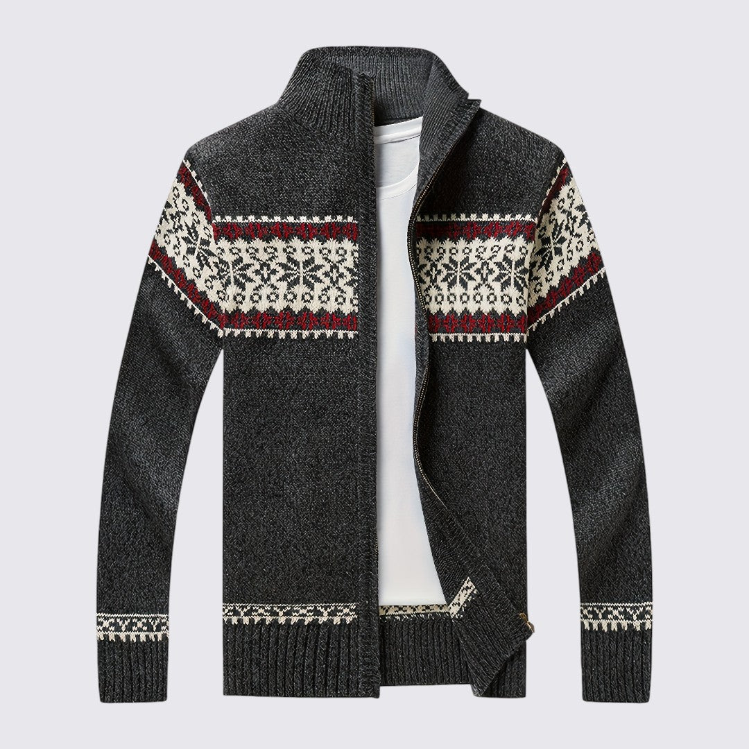 A cardigan for Men. The front shows a full-length zip closure. A stand collar frames the neckline when fastened. Patterned bands run across the chest, back, and sleeves. Long sleeves finish with ribbed cuffs. The hem is ribbed with a straight line. Intended for everyday layering in transitional weather.