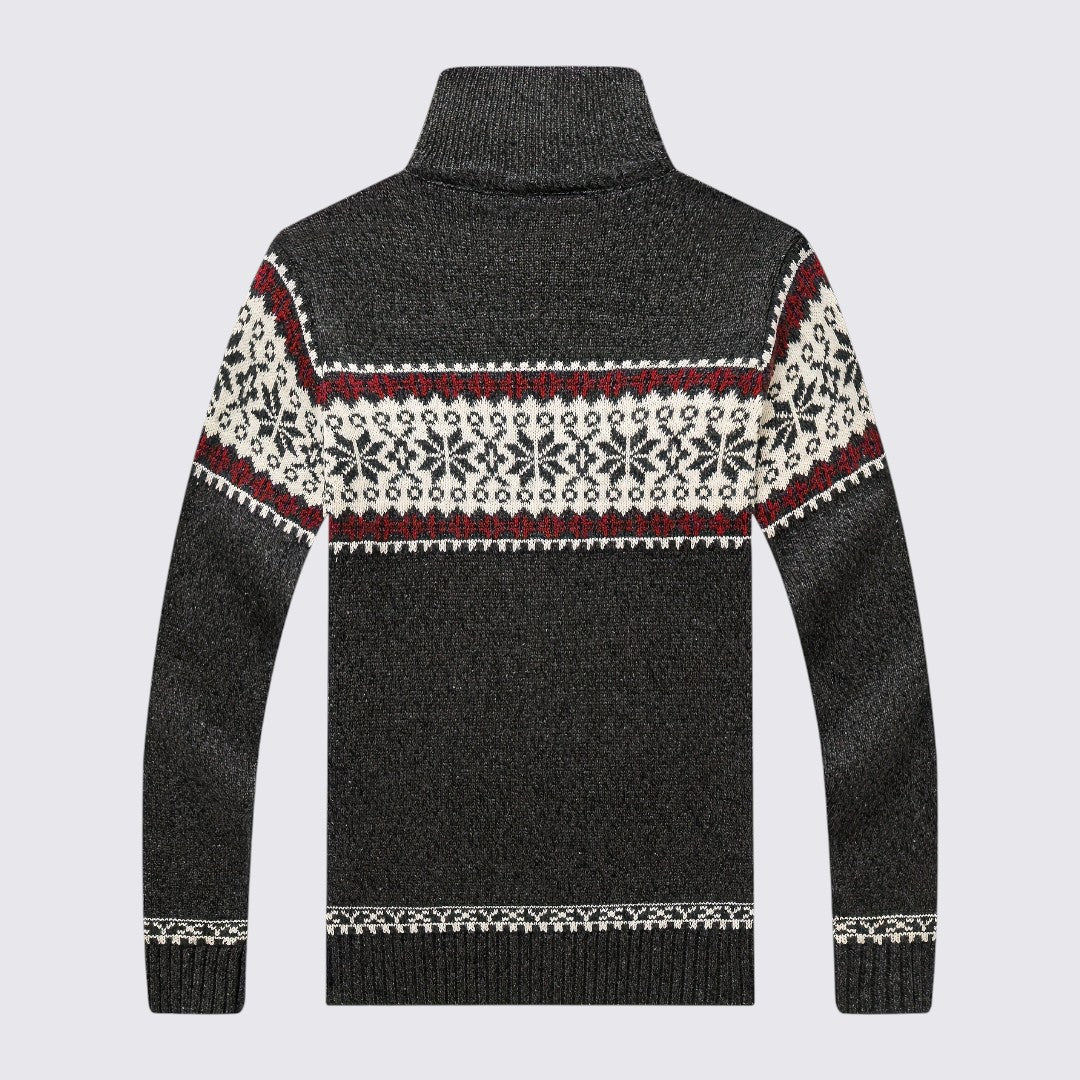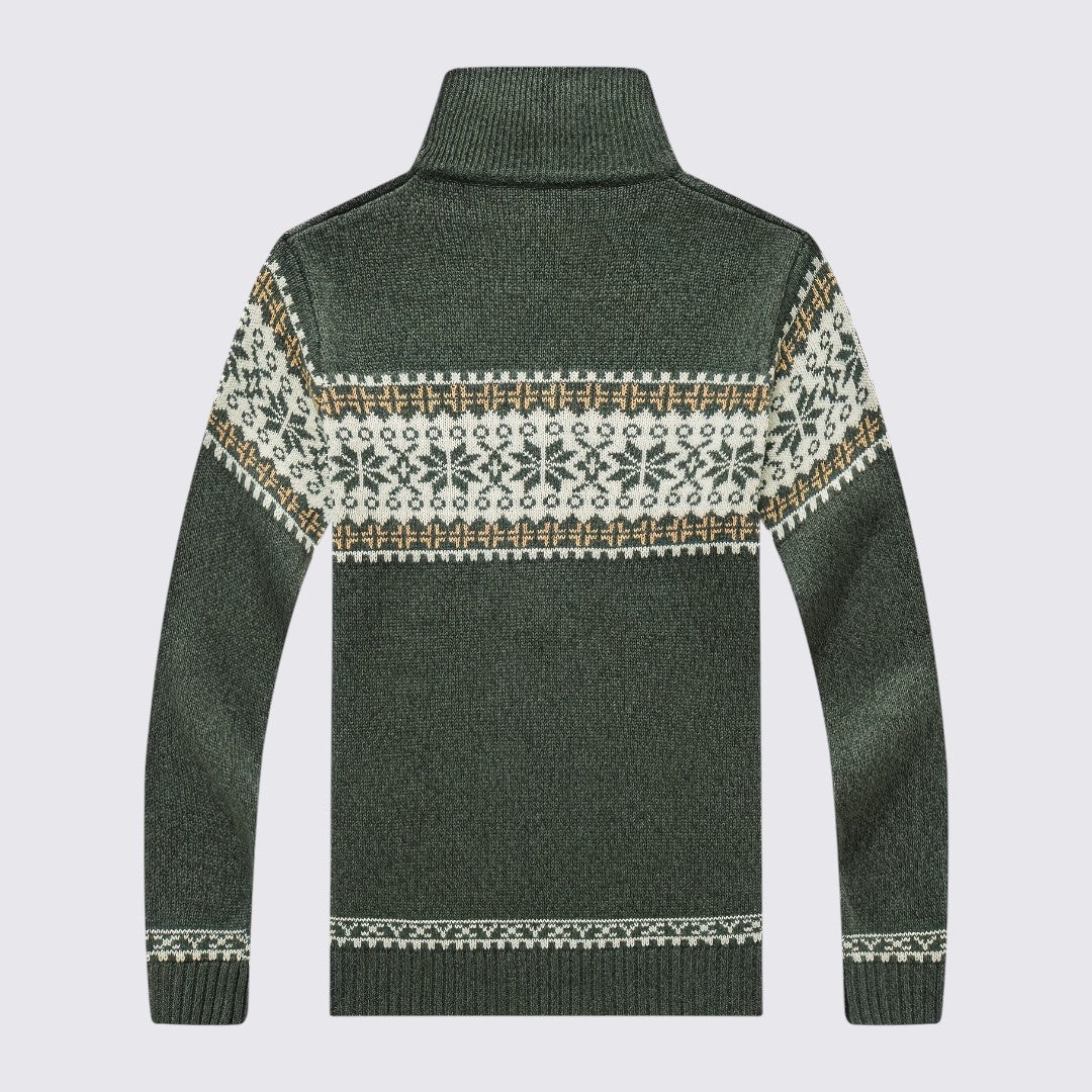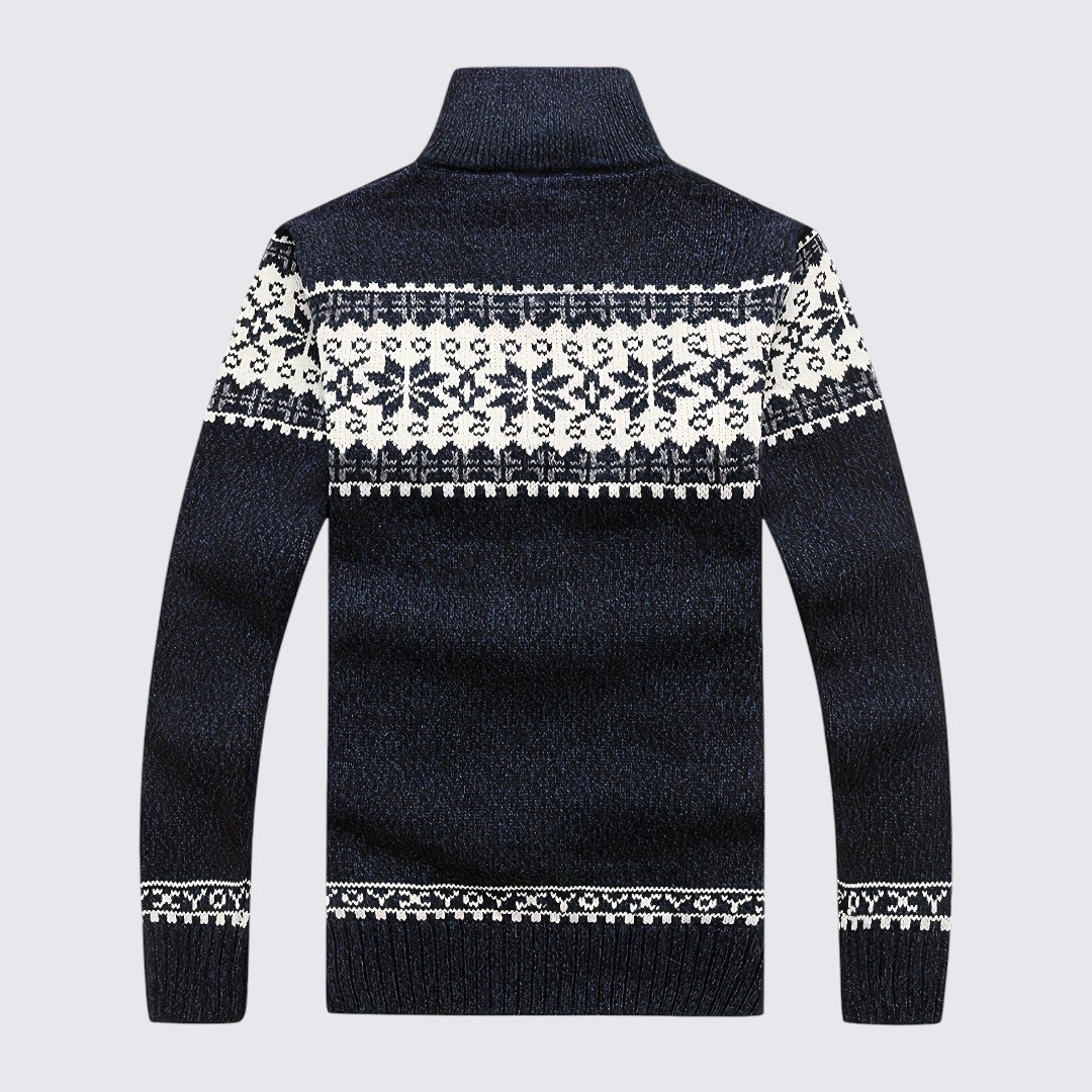 A cardigan for Men. The front shows a full-length zip closure. A stand collar frames the neckline when fastened. Patterned bands run across the chest, back, and sleeves. Long sleeves finish with ribbed cuffs. The hem is ribbed with a straight line. Intended for everyday layering in transitional weather.