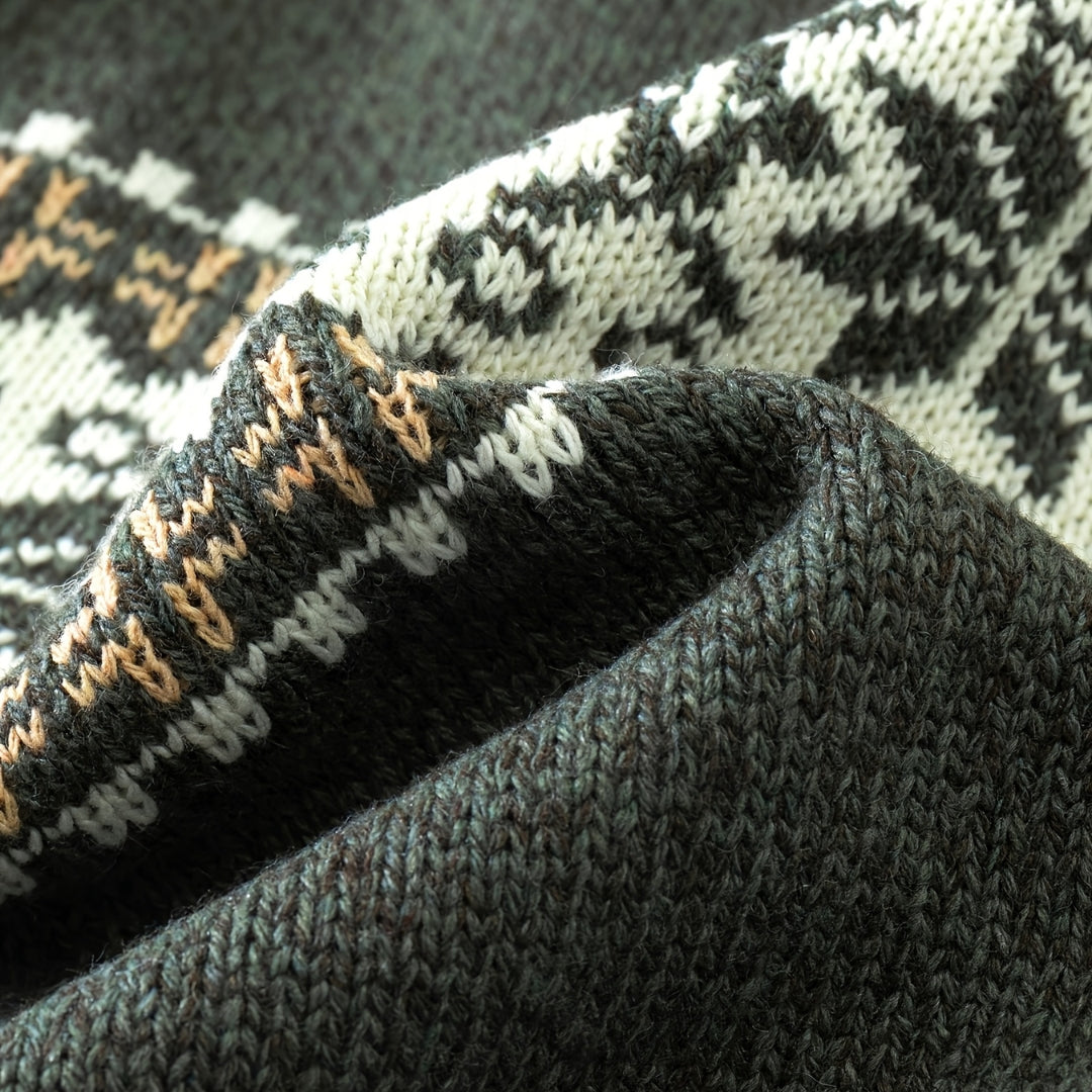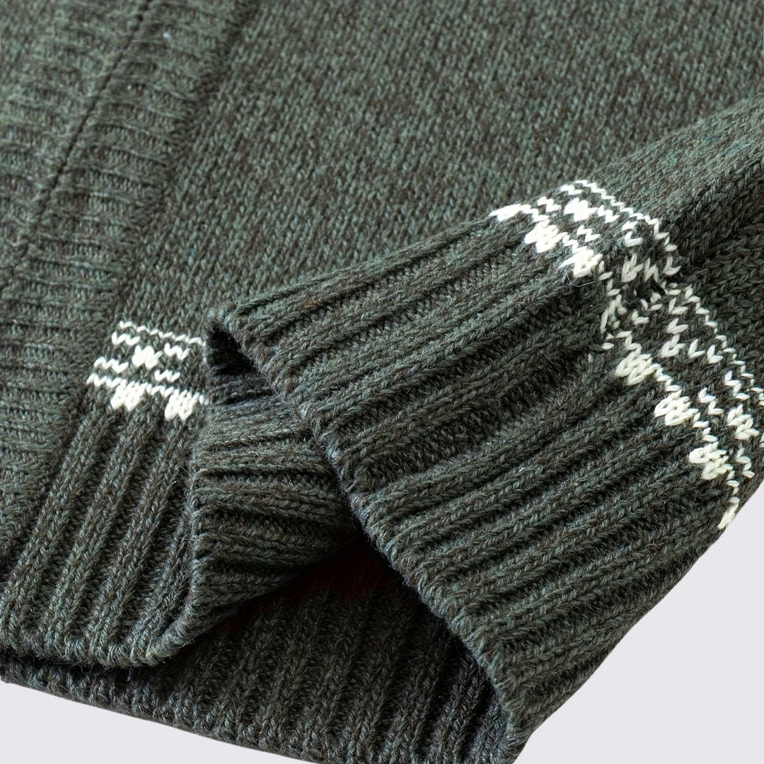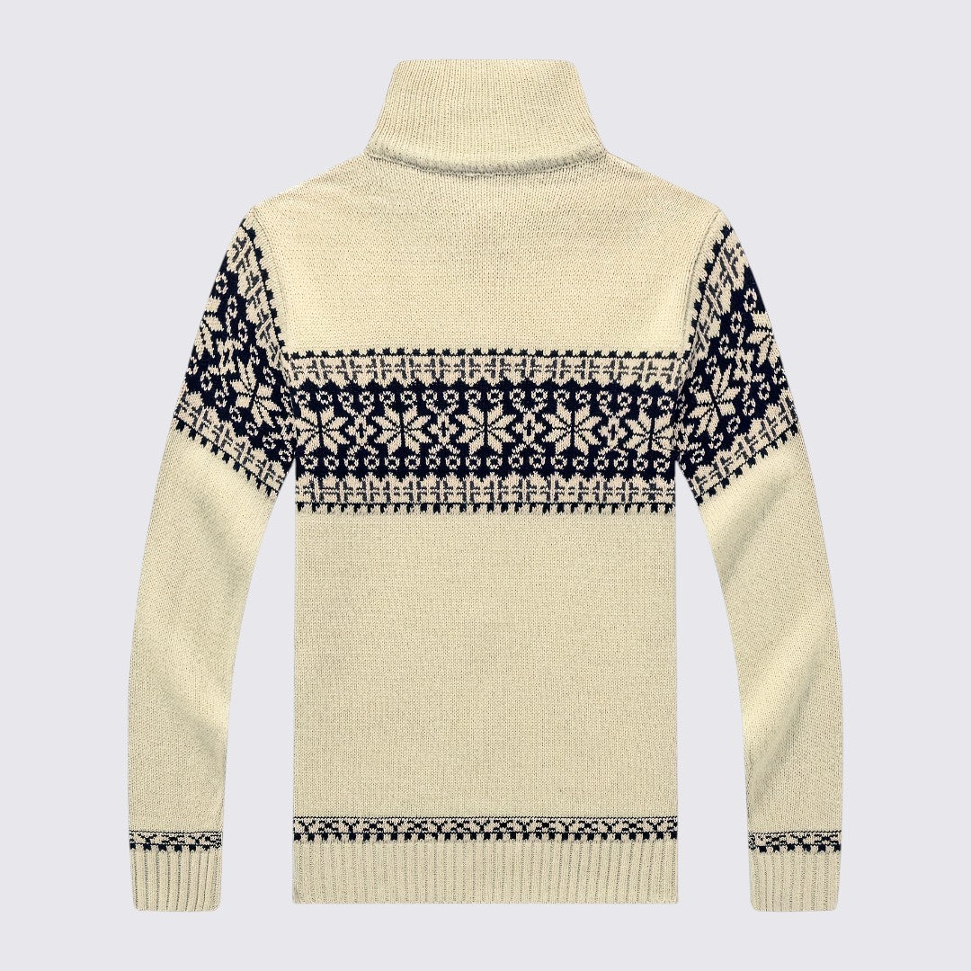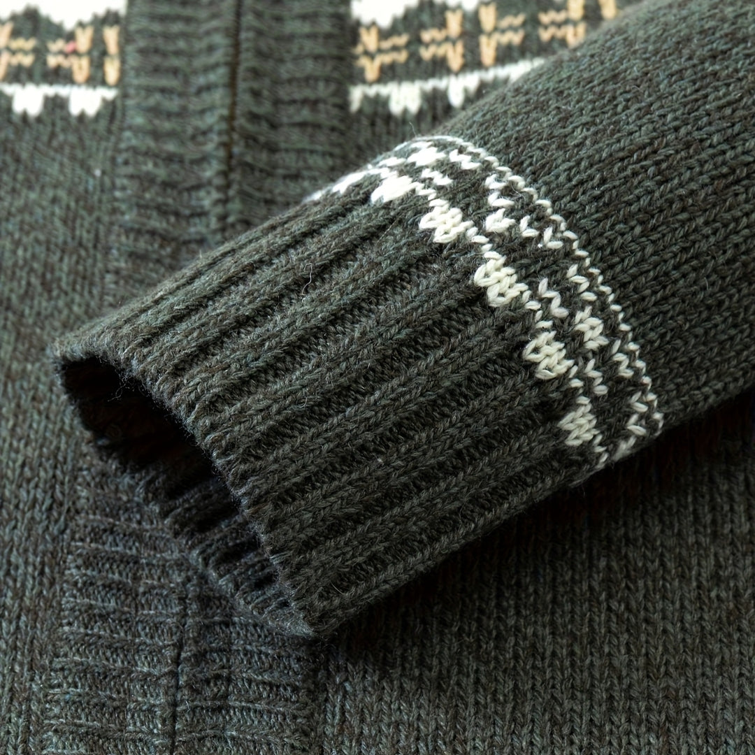 A cardigan for Men. The front shows a full-length zip closure. A stand collar frames the neckline when fastened. Patterned bands run across the chest, back, and sleeves. Long sleeves finish with ribbed cuffs. The hem is ribbed with a straight line. Intended for everyday layering in transitional weather.