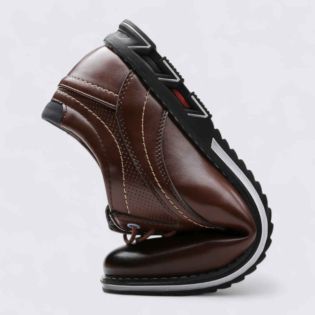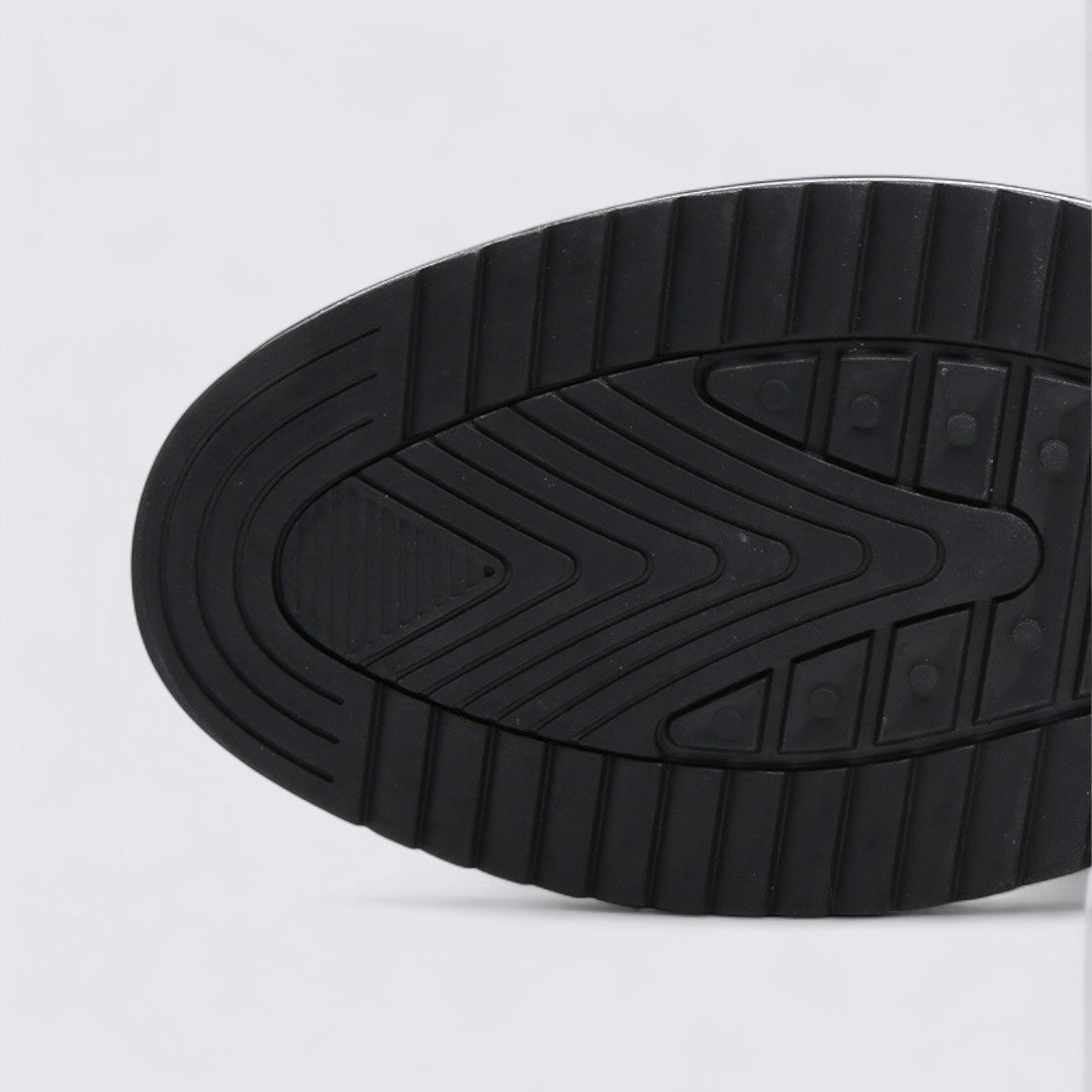 These shoes for Men feature a low-top profile. The toe appears rounded with a closed front. Visible stitching defines panels along the sides. Perforation details are present on selected sections. A raised heel is integrated into the design. The outsole shows a patterned lug arrangement. The overall look follows a straightforward, regular shape.