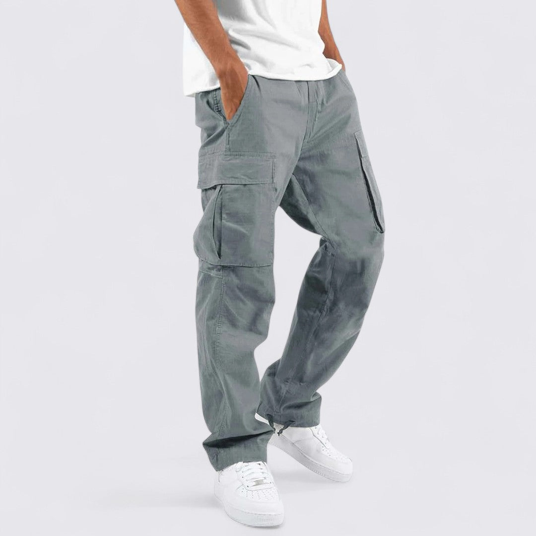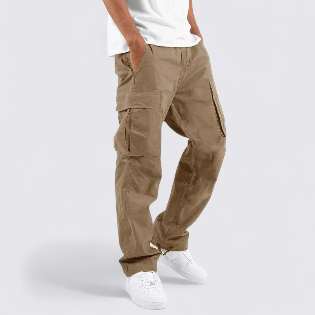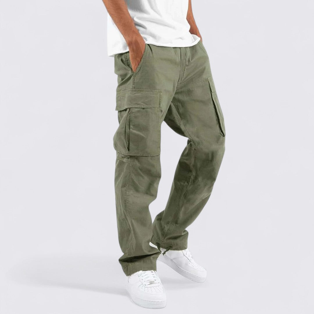 Cargo trousers for Men. The waist appears mid-rise with belt loops and a fly. The legs show a straight cut with a relaxed profile. Large cargo pockets sit on the thighs with flap closures. Additional side pockets are placed at the hips for storage. Back pockets are included for small items. Hem ties are visible at the ankles for adjustment.