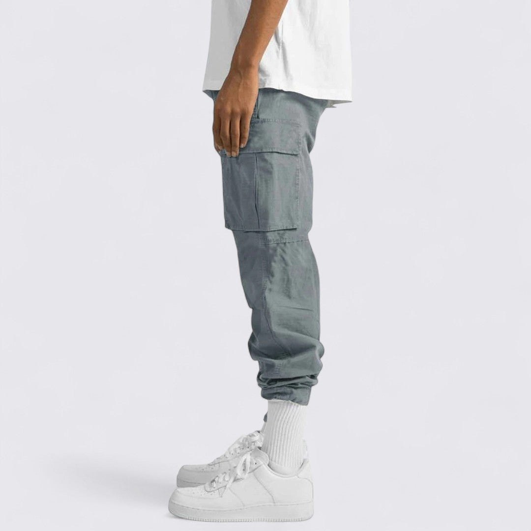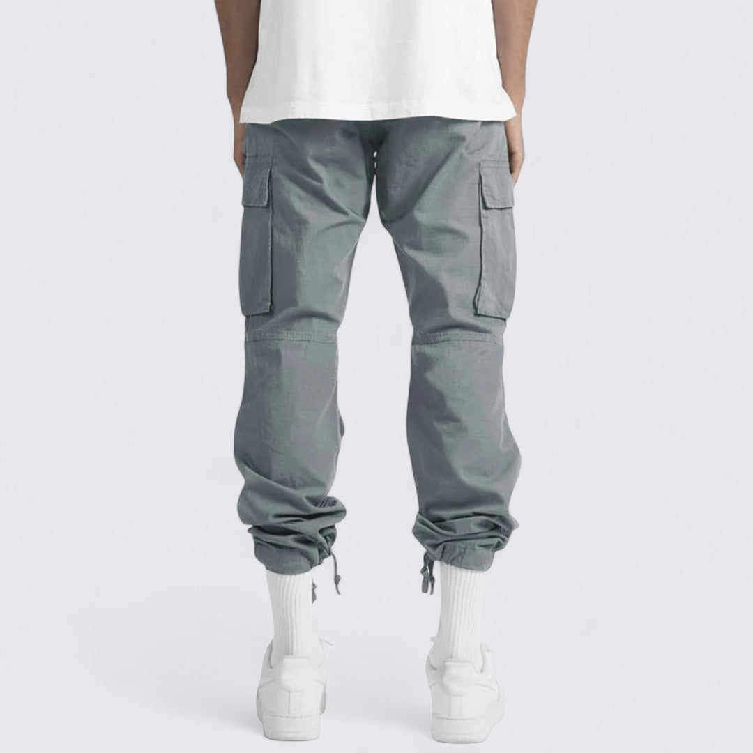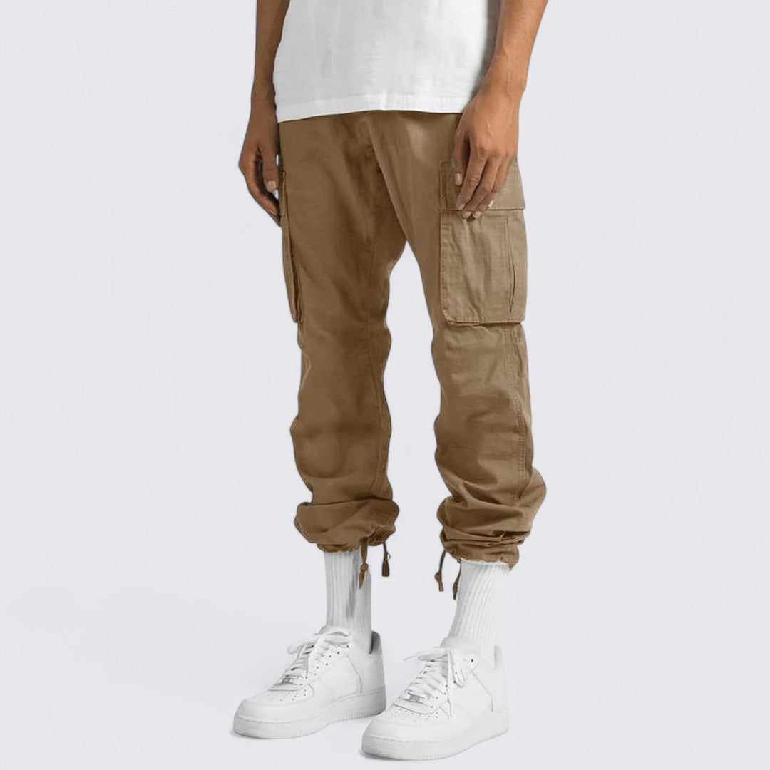 Cargo trousers for Men. The waist appears mid-rise with belt loops and a fly. The legs show a straight cut with a relaxed profile. Large cargo pockets sit on the thighs with flap closures. Additional side pockets are placed at the hips for storage. Back pockets are included for small items. Hem ties are visible at the ankles for adjustment.